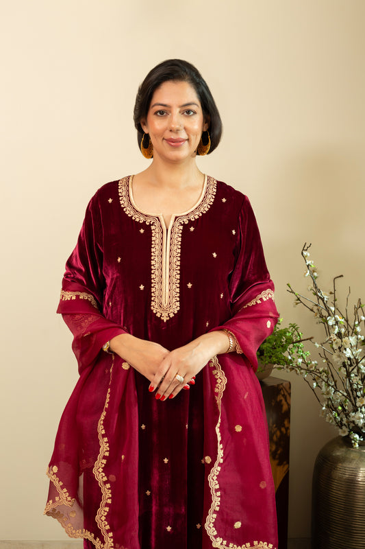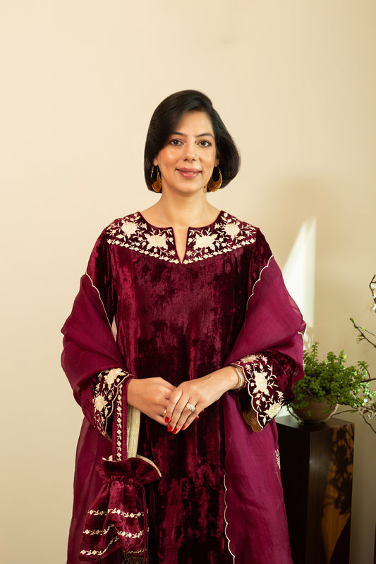 Kaner Wine Makhmal Embroidered Kurta Set With Pure Silk Organza Dupatta