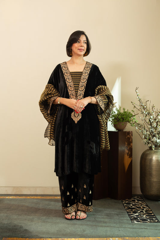 BLACK SILK VELVET KASHMIRI EMBROIDERED KAFTAN KURTA SET WITH PURE TISSUE ORGANZA TISSUE DUPATTA