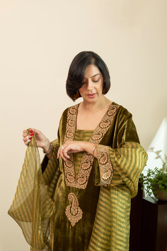 Mehndi Green Silk Velvet Kashmiri Embroidered Kaftan Kurta Set With Pure Organza Tissue Dupatta