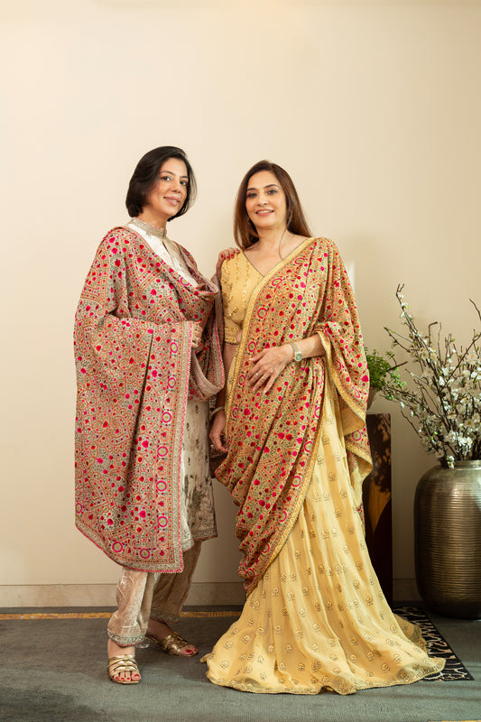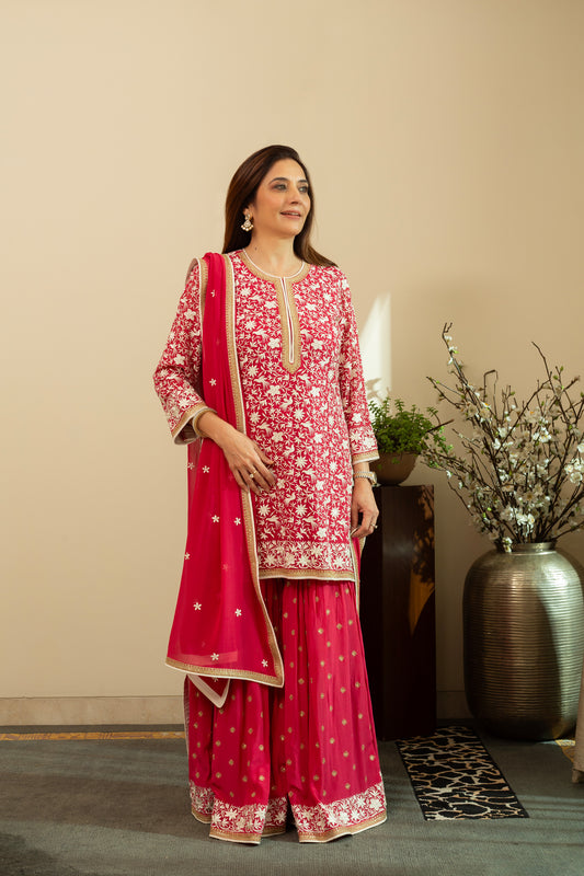 HEER Georgette Carmine Red Sharara Set with Parsi Bird Embroidery and intricate Aari Embroidery