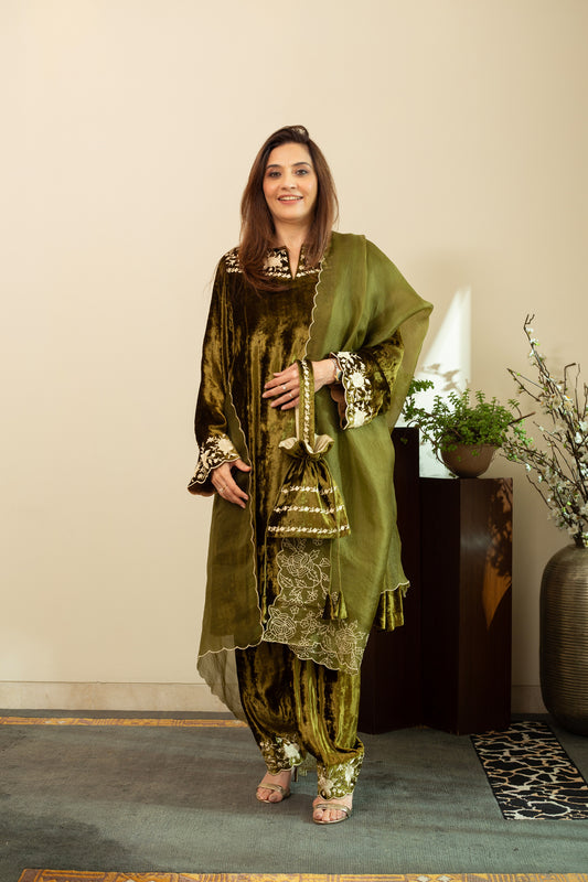 Kaner Mehndi Green Makhmal Embroidered Kurta Set With Pure Silk Organza Dupatta