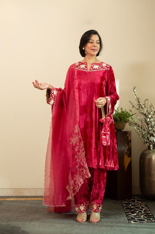 KANER Rani Pink Makhmal Velvet Kurta Set with Dupatta