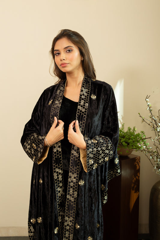 MAZNEEN Makhmal Zari Embroidery Cape in Black Colour