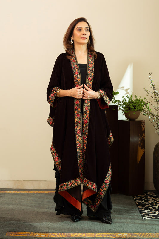 FAREEN Velvet Cape with Parsi Gara Embroidery in Umber Brown Colour