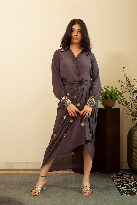 AAFREEN BEE Pure Silk Crepe Dhoti Skirt & Shirt with Gold Zari Embroidery in Sus Grey Colour