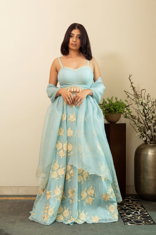 GULBANO Parsi Boota Lehenga in Powder Blue Colour