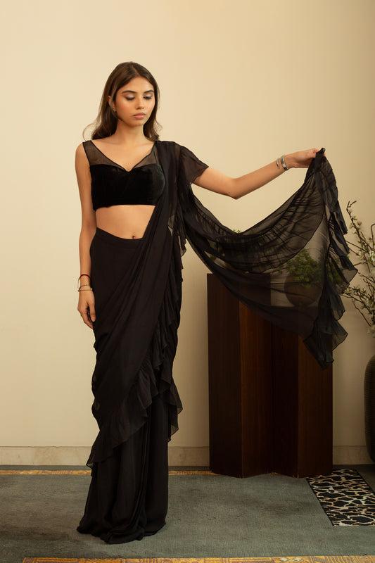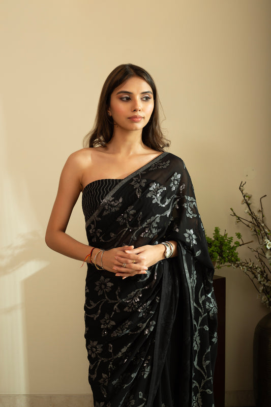 ISBAH Watercolour Sequence Flower Saree in Pure Silk Georgette Black Colour