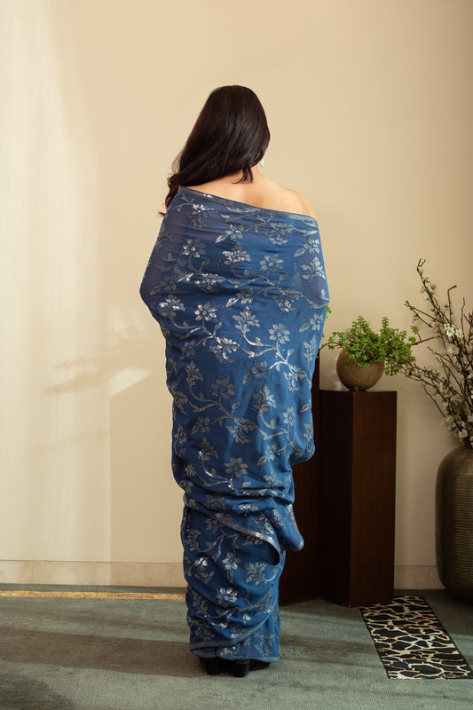 ISBAH Watercolour Sequence Flower Saree in Pure Silk Georgette Midnight Blue Colour