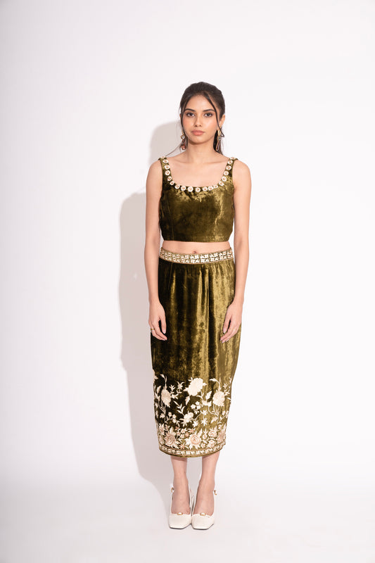 Mehndi Green Makhmal Embroidered Back Slit Straight Skirt