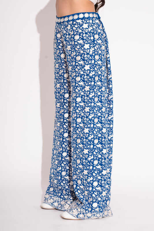 Sapphire Blue Pure Silk Crepe Embroidered Straight Pants