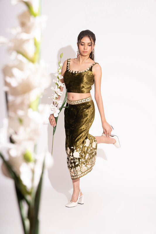 Mehndi Green 3D Flower Makhmal Blouse with Makhmal Embroidered Straight Skirt with Back Slit 2 Pc Set