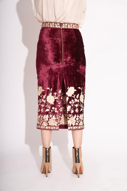 Wine Makhmal Embroidered Back Slit Straight Skirt