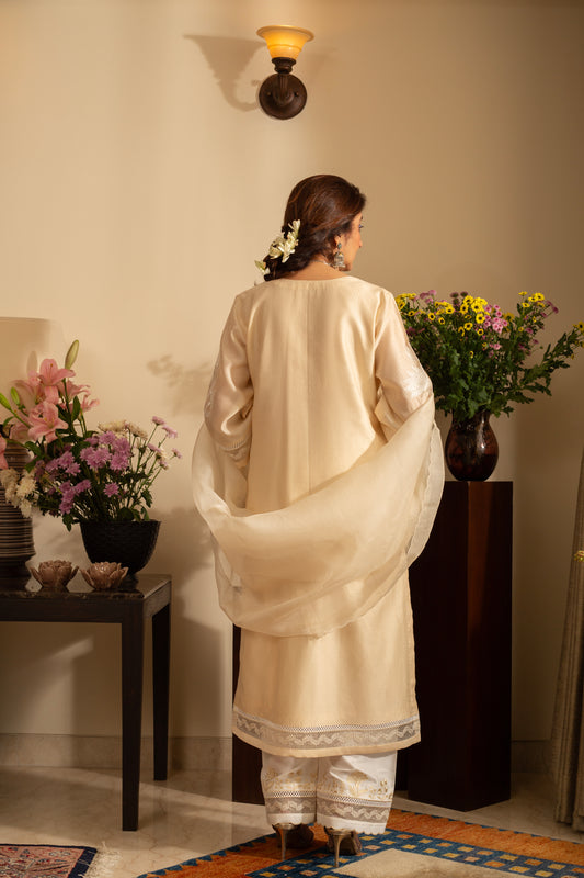 Chandni Almond Ivory Pure Silk Chanderi 3 pc Embroidered suit set with pure organza scalloped dupatta
