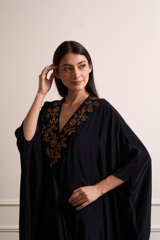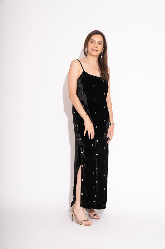 Black Silk Velvet Spaghetti Gown with Embroidery