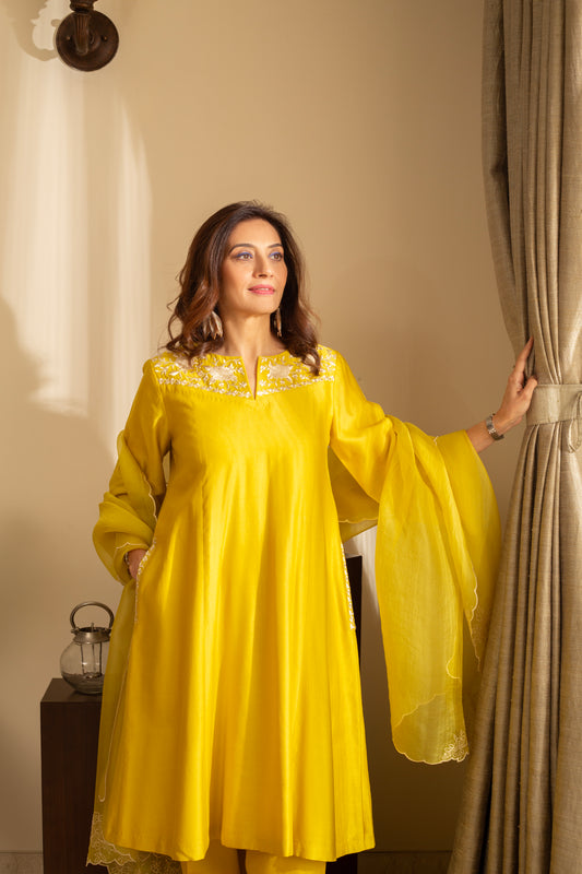 Kaner Lime Embroidered Pure Silk Chanderi 3 Pc Kurta Set with pure organza scallop dupatta