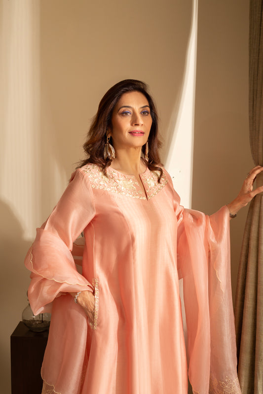 Kaner Pastel Peach Embroidered Pure Silk Chanderi 3 Pc Kurta Set with pure organza scallop dupatta