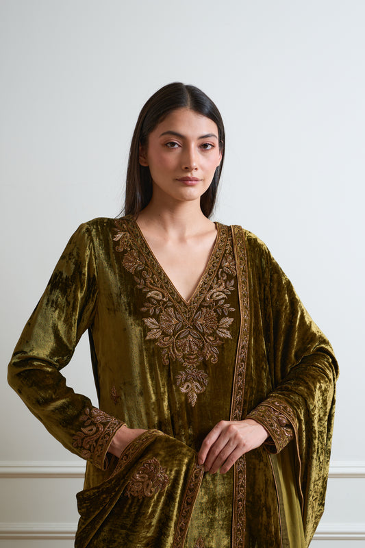 Kesar Mehendi Green Pure Silk Velvet Kurta Set with Heavy Duptta