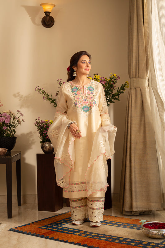 Gulchini Almond Ivory Embroidered Pure Silk Chanderi 3 Pc Kurta Set with cutwork and pure organza scallop Dupatta