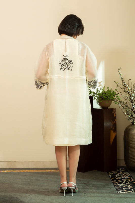 Zainab Ecru Pure silk Chanderi Shift Dress with Pure Silk Organza Overlay Jacket in Black Floral Embroidery