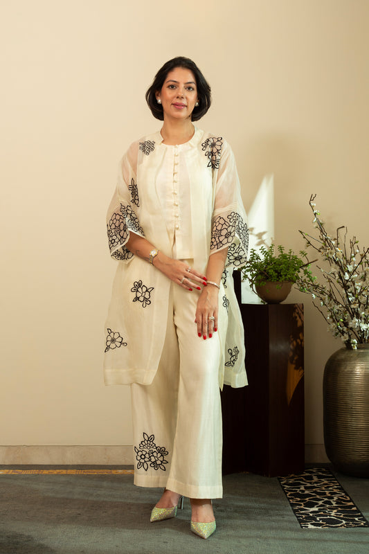 Poppy Off White Embroidered Pure Silk Georgette 2 Pc Indo Western Coord Set with Flared Pants