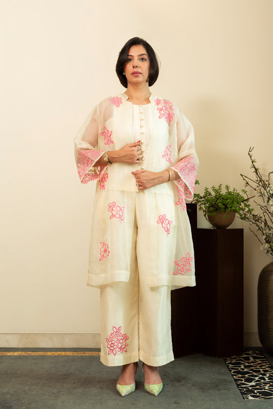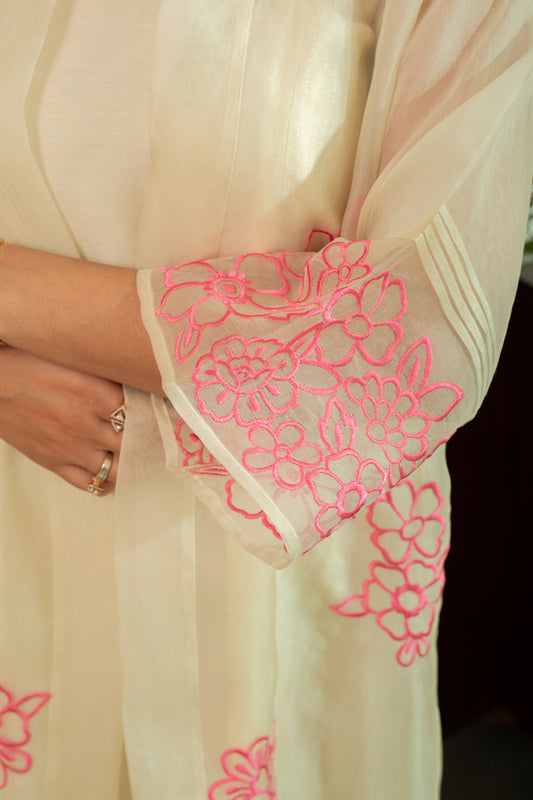 Zainab Ecru Pure silk Chanderi Shift Dress with Pure Silk Organza Jacket with Pink Floral Embroidery