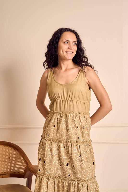 FLUER ELAN SAGE Cutwork Embroidery Tiered Midi Dress