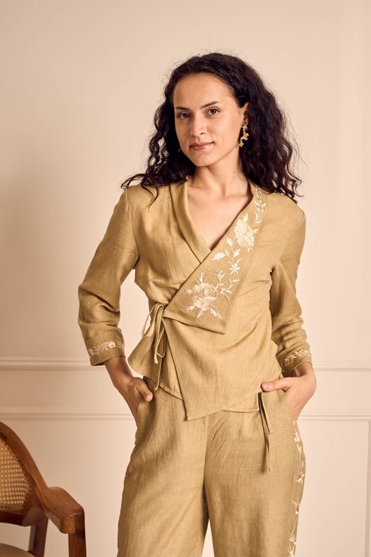 OLIVE GRACE Sage Wrap collar placement embroidery Coord set with Side seam embroidery on pant