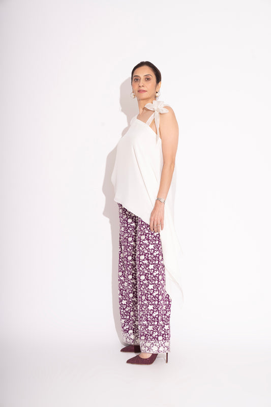White Pure Silk Crepe Off Shoulder Asymmetrical Top