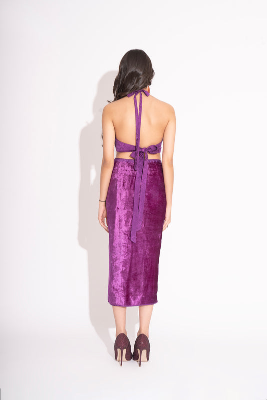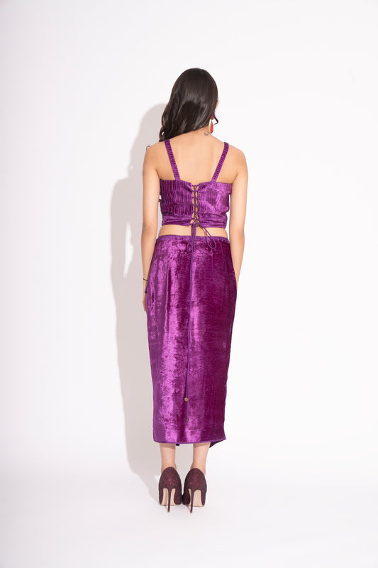 Violet Embroidered Tie Up Makhmal Blouse with Front Slit Makhmal Skirt