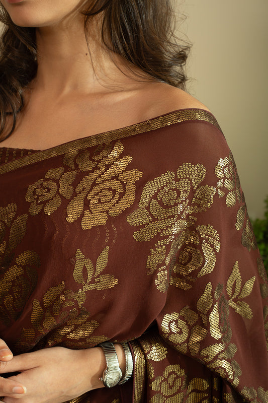 SANA ROSE Dull Gold Sequin Saree in Chocolate Brown Colour
