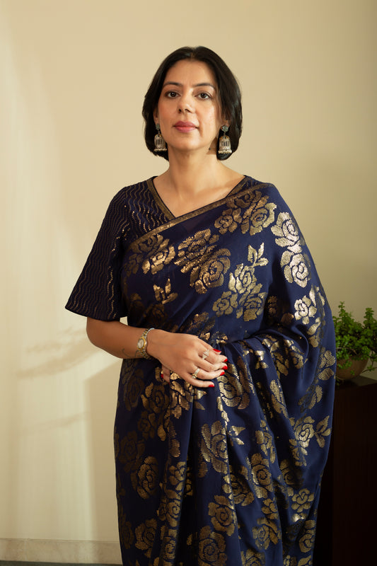 SANA ROSE Dull Gold Sequin Saree in Navy Blue Colour
