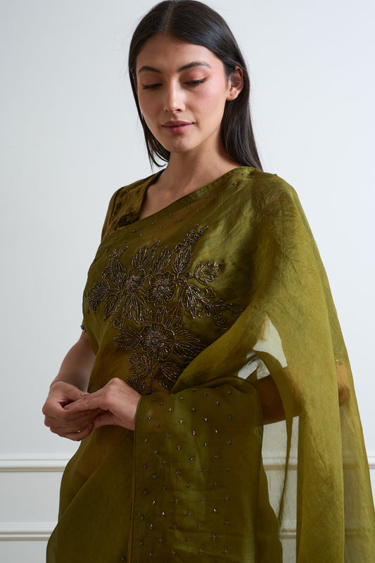 Parijat Mehendi Green Organza Cutdana Saree