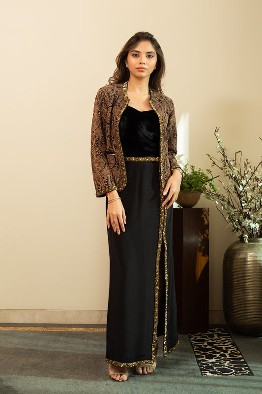 Navy Blue Silk Crepe Jacquard Bustier with Front Slit Makhmal Embroidered Skirt