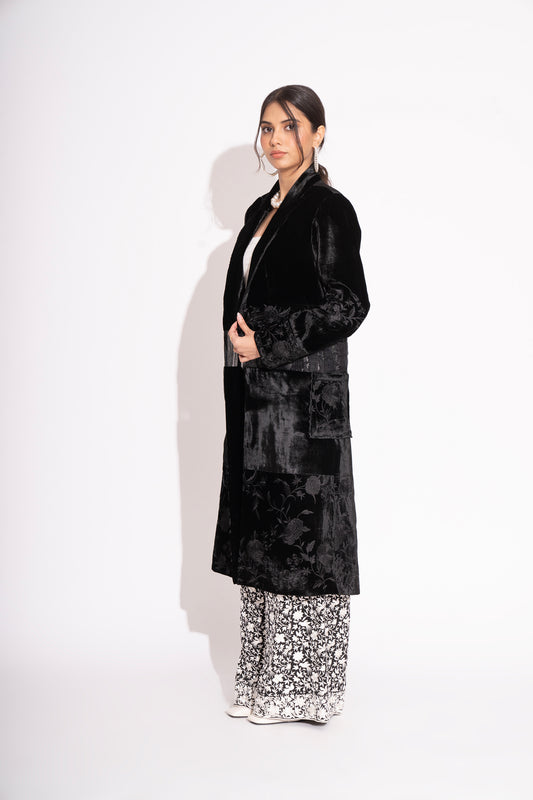 Black Silk Velvet Embroidered Overcoat with Pure Silk Crepe Jacquard Lining