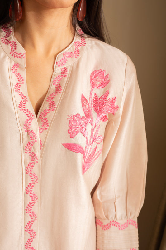 Gul-Meh Nude Pink Embroidered Coord Set Suit on Pure Silk Chanderi