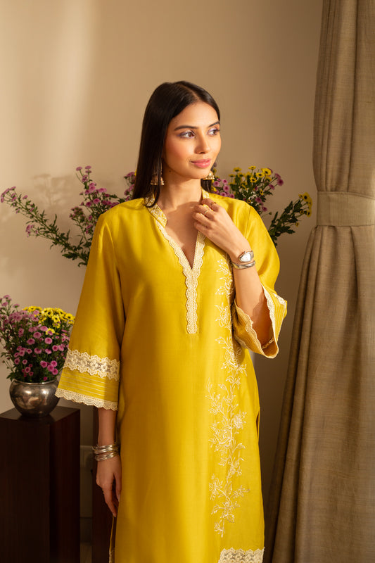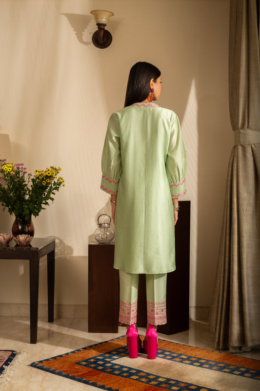 Gulbahar Lime 2 pc Pure Silk Chanderi Coord Set with cutwork Embroidery