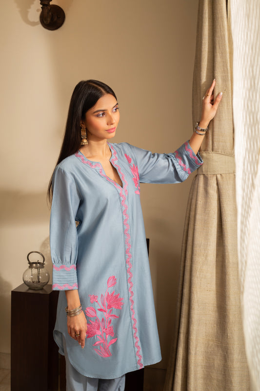 Gul-Meh Aqua Blue Embroidered Coord Set Suit on Pure Silk Chanderi
