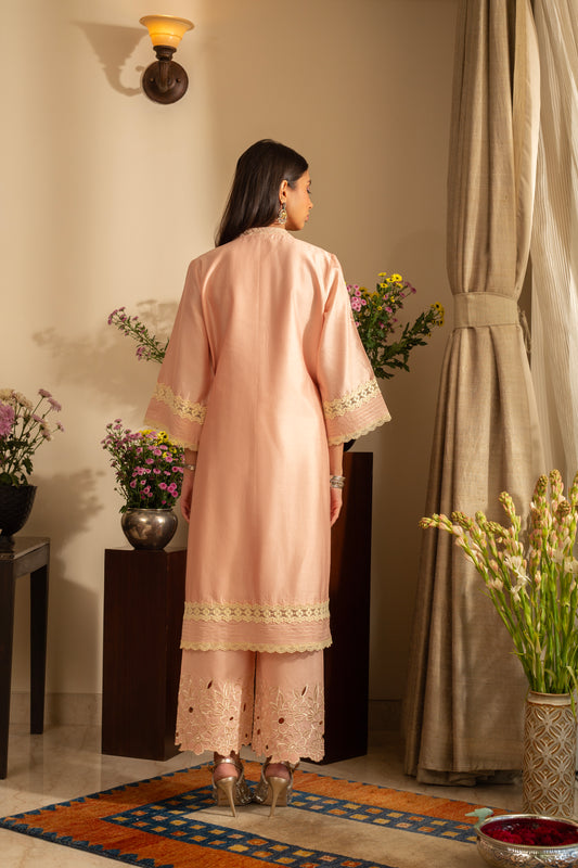 Gulbahar Pastel Peach 2 pc Pure Silk Chanderi Coord Set with cutwork Embroidery