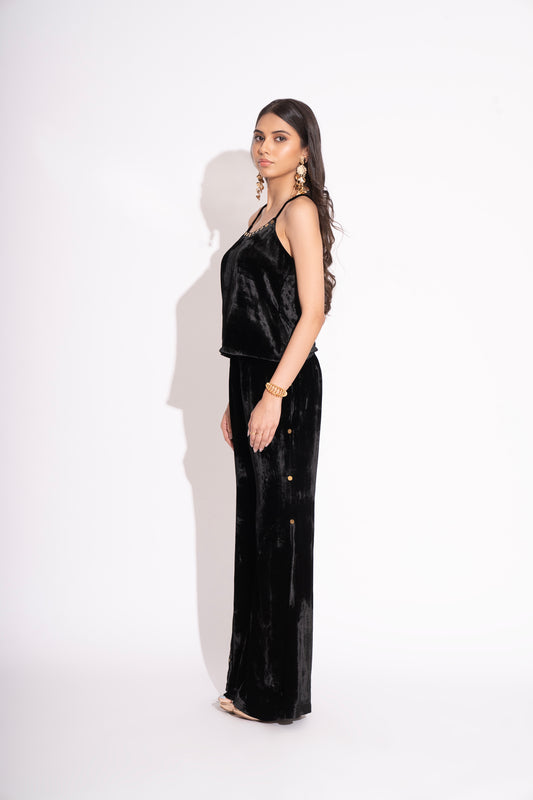 Black Silk Velvet Metal Detail Spaghetti with Metal Detail Silk Velvet Flared Pants