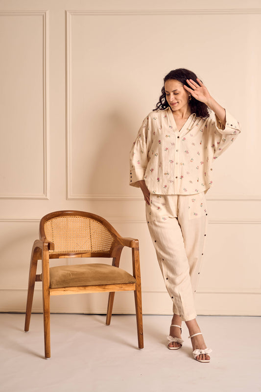 MEADOW MUSE IVORY Ditsy flower Embroidered Coord set in Linen