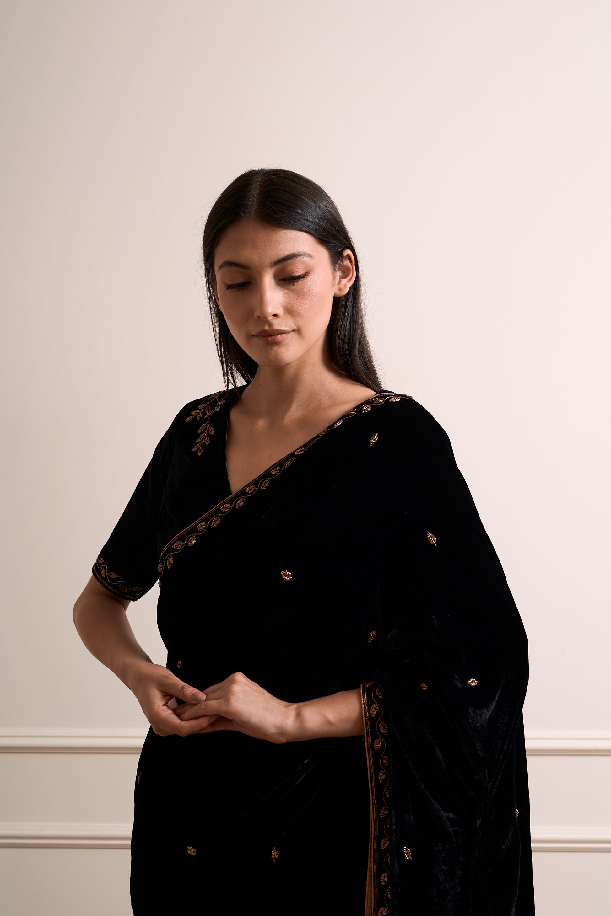 - Blouse: Pure silk Velvet with placement embroidery on front and back