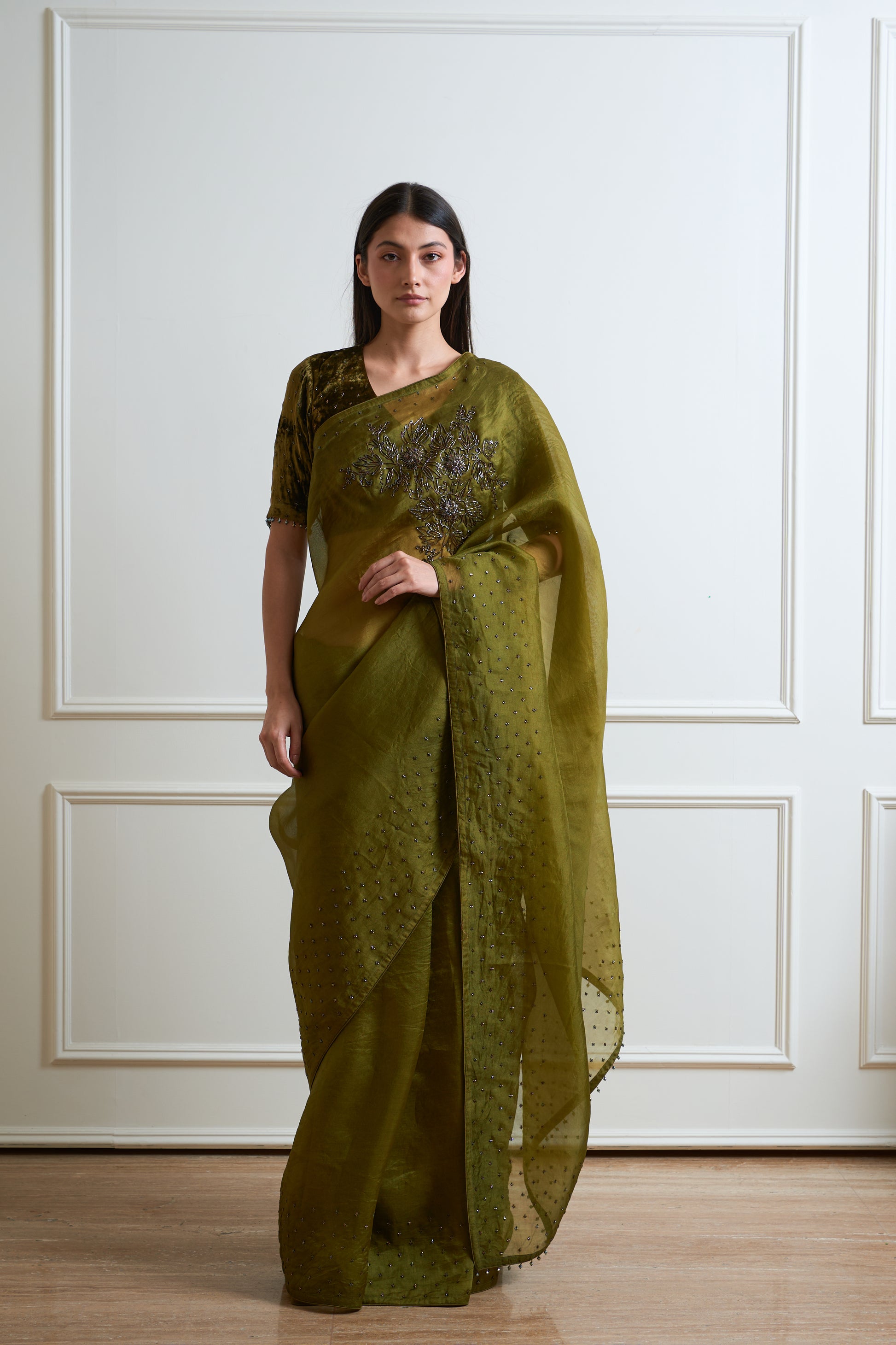 Drape yourself in timeless elegance with our PARIJAT Pure Silk Organza Saree, delicately hand-embroidered with cutdana detailing. The sheer organza fabric adds a touch of ethereal charm, beautifully balancing tradition with modern sophistication. Paired with a pure silk Velvet blouse, featuring complementary intricate embroidery and artisanal finesse, this ensemble is perfect for evenings and get togethers that call for understated luxury.